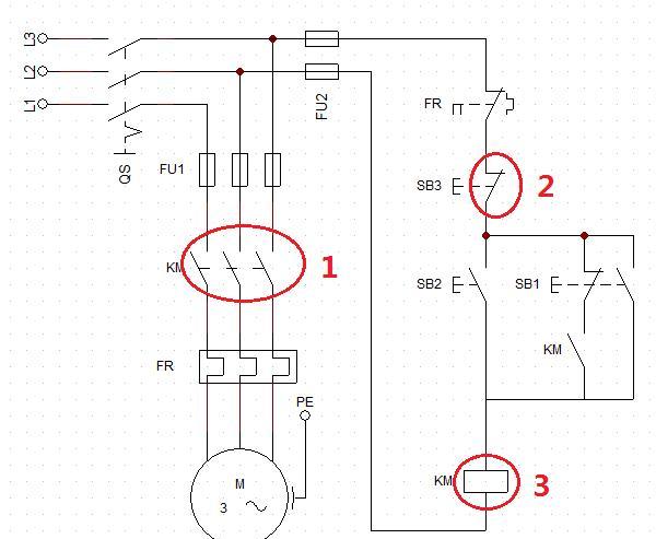 比如,圖中KM表示交流接觸器,紅圈1中的符號表示主觸點,把它們(文字符號和圖形符號)組合起來就是交流接觸器的主觸點。知道這個以后,然后我們接下來就要能在配電柜里能找到對應的接觸器,再在接觸器上能找到對應的主觸點。