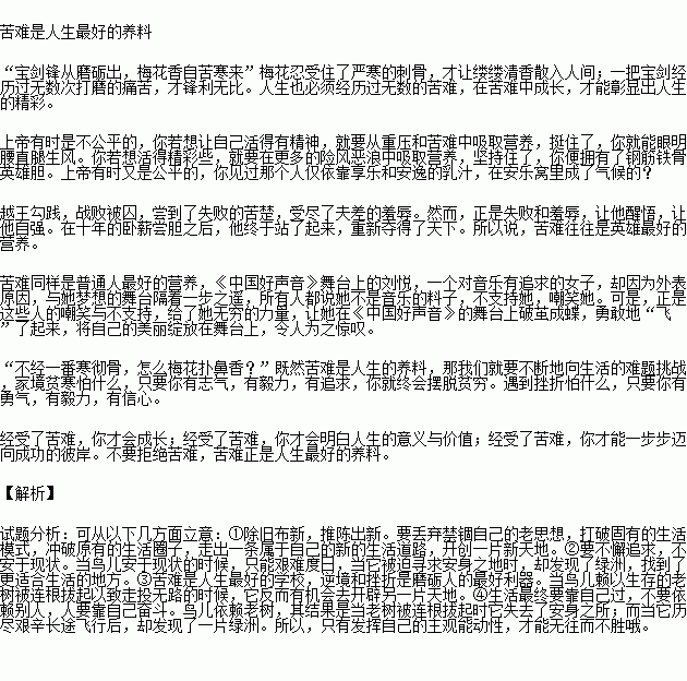 我們奮斗,我們拼搏,我們自豪!我們將點燃種子的希望,召喚候鳥的飛翔,像飛揚的蒲公英一樣,沿著夢想的軌道,勇敢地踏上屬于自己的旅程!3 在風(fēng)雨中成長陽光明媚的春天,我追求那灼灼其華的桃花;赤日炎炎的夏天,我追求那接天映日的荷花;碩果累累的秋天,我追求那猶傲霜枝的金菊;寒風(fēng)凜冽的冬天,我追求那猶有暗香的雪梅。—題記小草之所以青翠,因為它擁有對美的追求;樹木之所以繁茂,因為它擁有對高大的追求;;雄鷹之所以能搏擊長空,因為它擁有對廣闊藍天的追求;河流選擇了高崖,寧可粉身碎骨,結(jié)果美麗由瞬間而至永恒,它追求的是勇往直前;飛鳥選擇了天空,就算筋疲力盡,也要在風(fēng)雨中逐漸成長,它追求的是敢于拼搏……成長的路上,因為有了追求才更具意義。