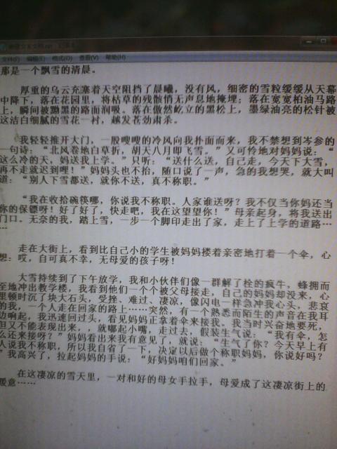 這時我才注意到她雨衣已經(jīng)緊貼著身體,全身已經(jīng)是濕透了。 看著她騎著自行車搖搖晃晃地消失在風(fēng)雨中,突然之間鼻子有一絲酸酸地感覺。