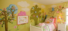 (3)兒童房使用墻繪,俏皮可愛集于一身,動畫片中的各類動物,是兒童房手繪壁畫的主角。選作畫墻面約4-8平米,占墻面三分之二。